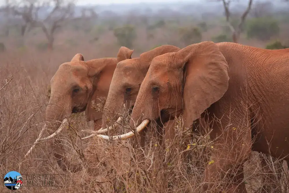 Il Tsavo West è una terra che sembra scolpita dal fuoco e dal tempo: rocce rosse, colline vulcaniche e acacie spinose creano un paesaggio aspro e spettacolare, dove ogni curva della pista regala una sorpresa. Qui gli elefanti si tingono di ruggine, ricoprendosi di terra vulcanica fino a diventare i celebri “elefanti rossi” e non è raro imbattersi nei maestosi Super Tusker*, con zanne tanto lunghe da sfiorare il suolo. Intorno, branchi di giraffe, bufali e antilopi si muovono tra la polvere, mentre i leoni di Tsavo continuano ad alimentare leggende di forza e mistero.